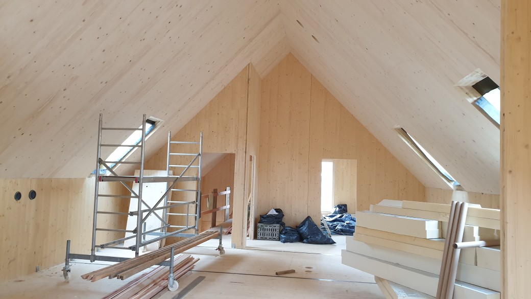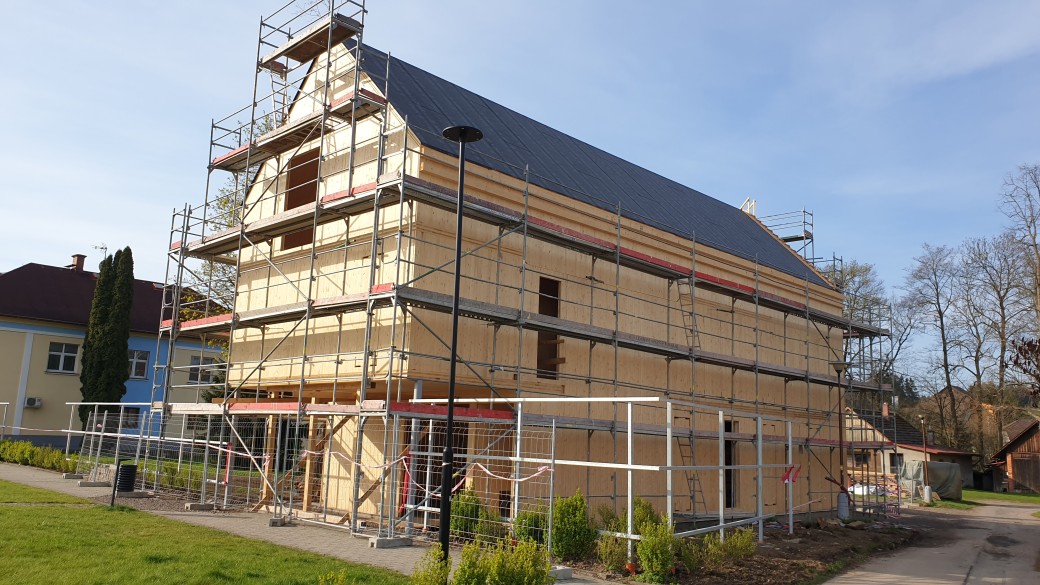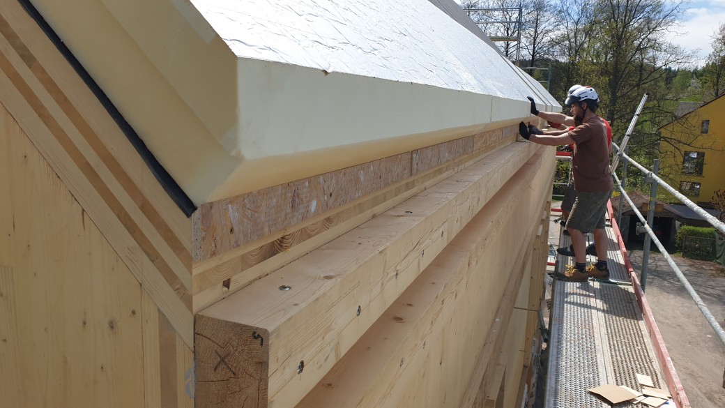 Na nosnú konštrukciu strechy z CLT panelov bola celoplošne nalepená parotesniaca a vzduchotesniaca vrstva z asfaltovaného pásu TOPDEK AL BARRIER. Po pokládke sa realizovala tepelnoizolačná vrstva z PIR dosiek TOPDEK 022 PIR.