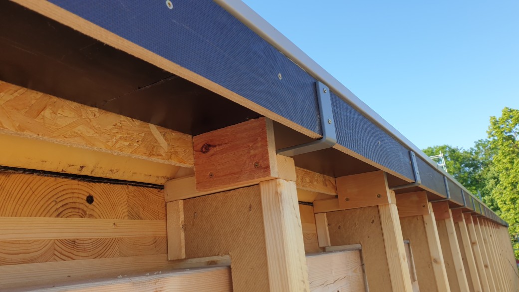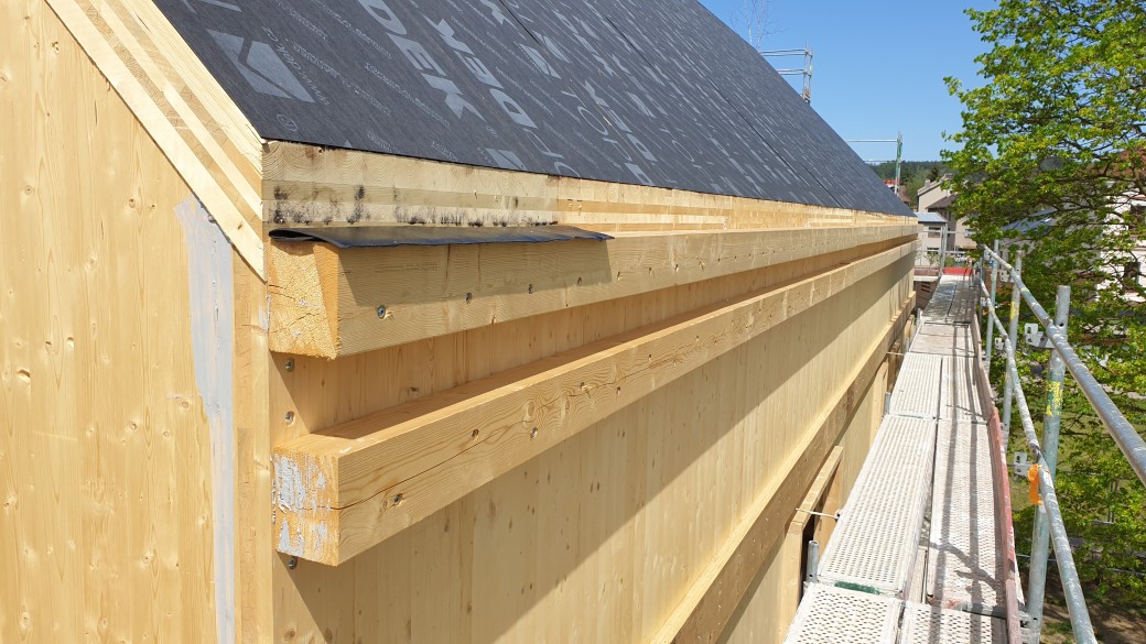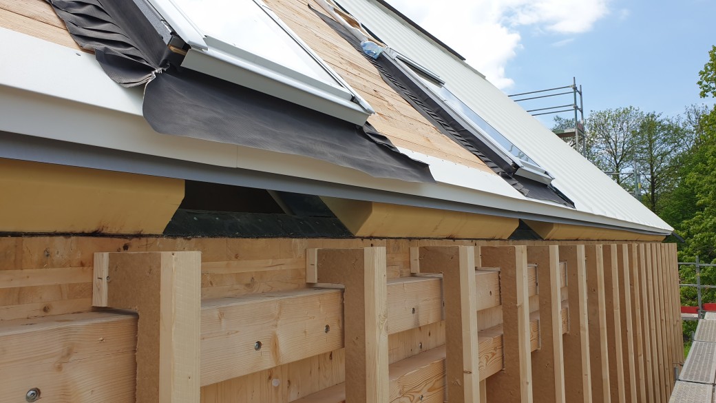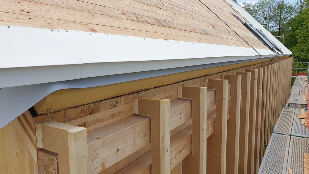 Súčasne sa realizovala montáž zvislého roštu fasády z drevených I-profilov, medzi ktorými bola následne doplnená tepelná izolácia z minerálnych vlákien. Napojenie žľabu na konštrukciu fasády bolo realizované veľmi čisto a esteticky.