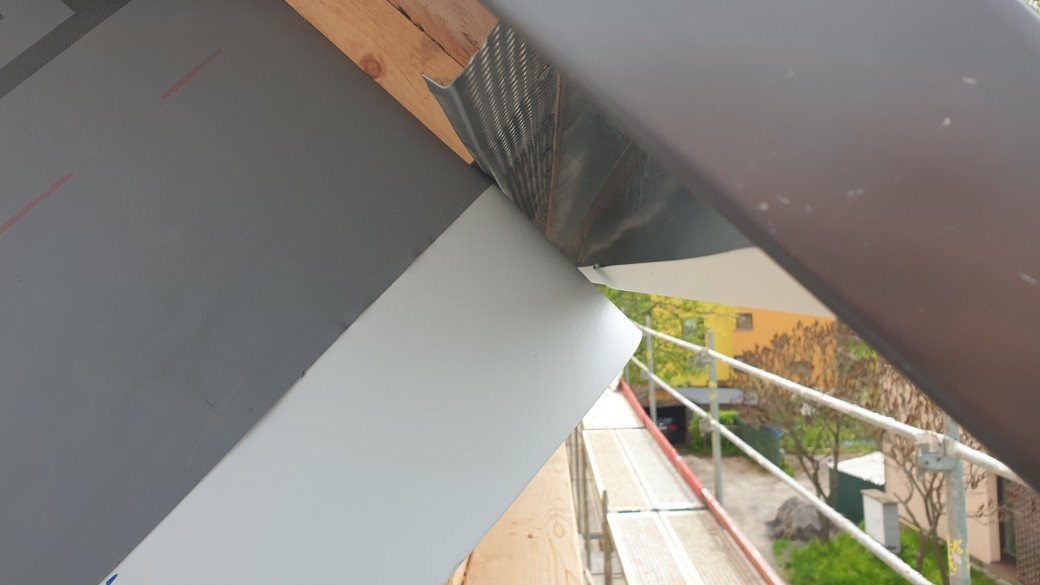 Na plochu PIR dosiek bola položená difúzne otvorená poistná hydroizolačná vrstva (PHV) DEKTEN MULTI PRO II. V mieste budúceho žľabu bola PHV ukončená a obojstrannou lepiacou páskou napojená na pás hydroizolačnej fólie z mäkčeného PVC ALKORPLAN 35276, ktorý bude tvoriť povlakovú hydroizolačnú vrstvu budúceho žľabu. Z priloženej fotodokumentácie je jasné, že šírka presahu a napojenia je kritickým detailom vyžadujúcim si starostlivosť a zároveň musí byť tento spoj zrealizovaný v dostatočnej výškovej úrovni nad prepadovou hranou žľabu, aby pri naplnení žľabu vodou nedochádzalo k zatečeniu do skladby.
