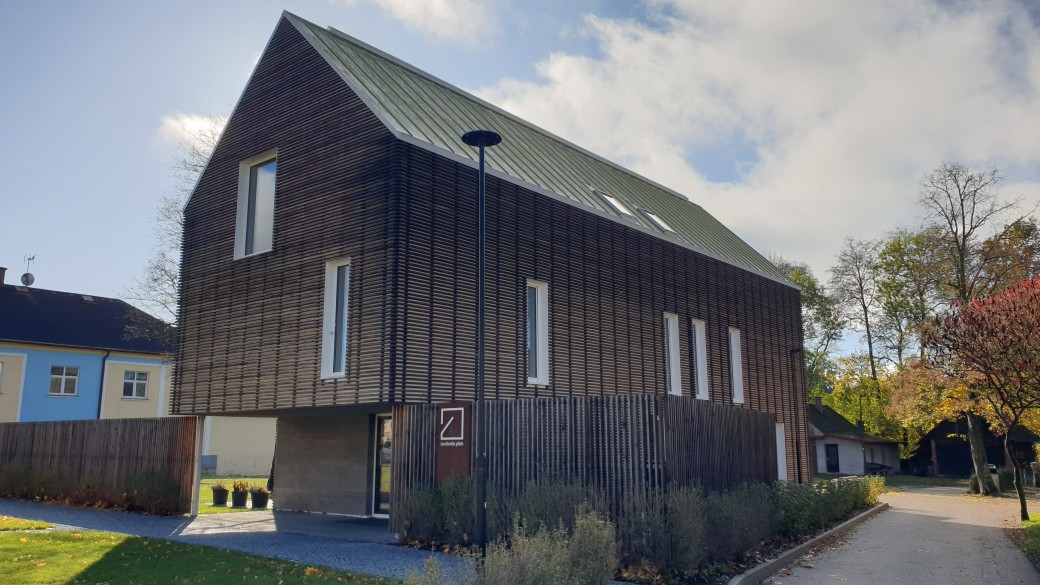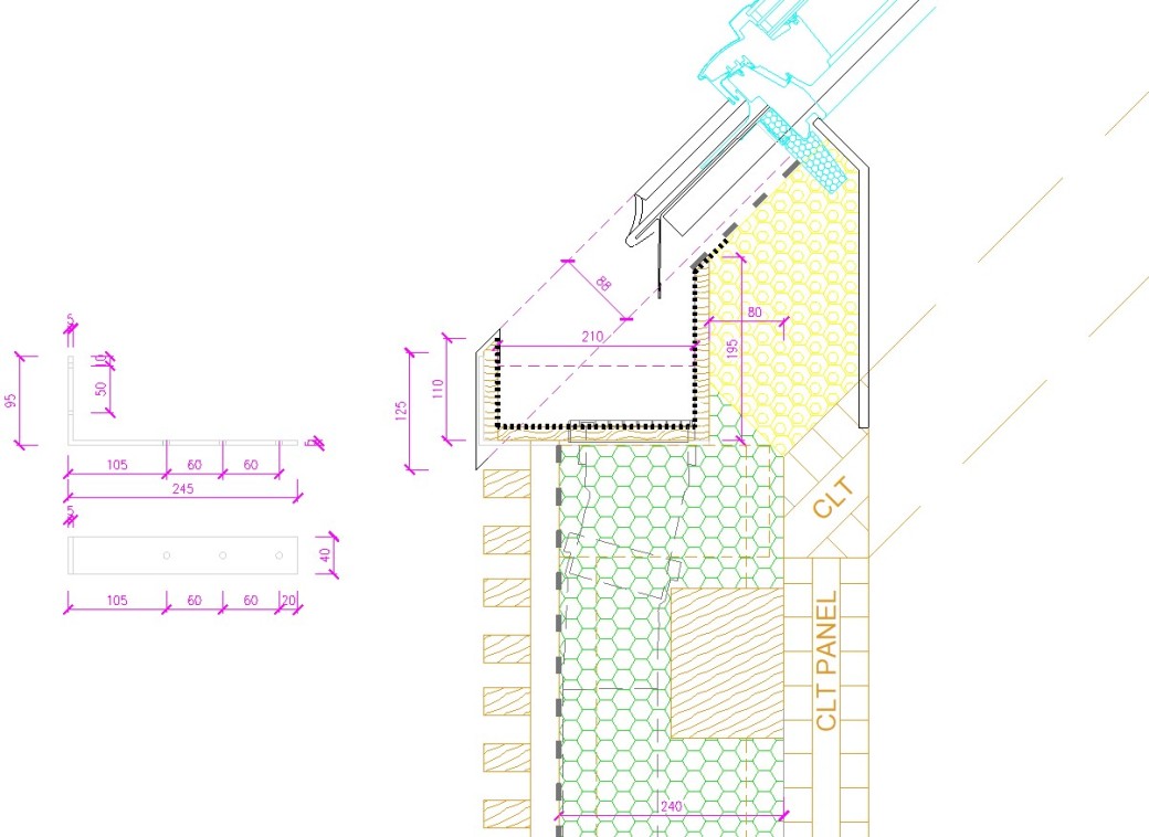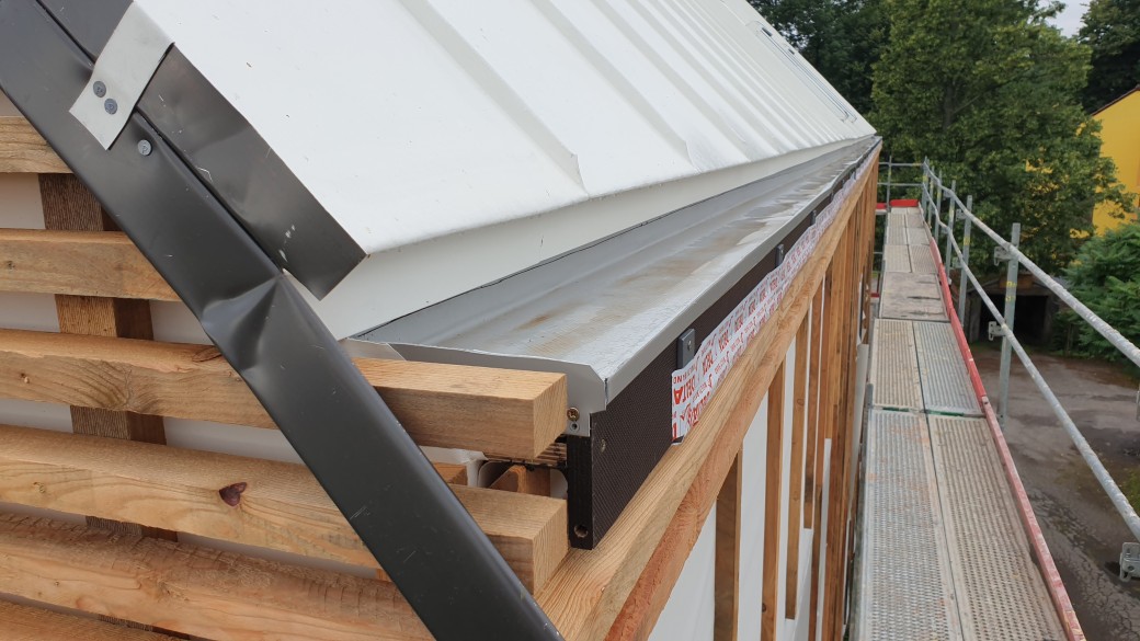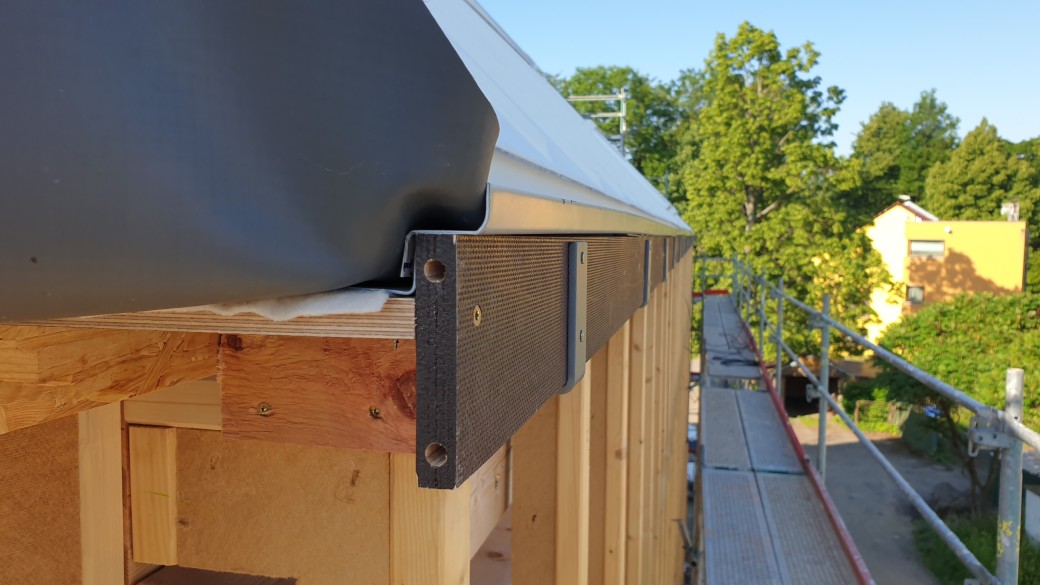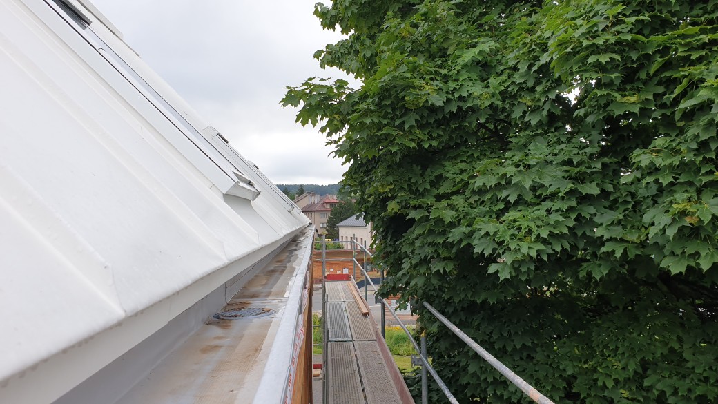 Zaujímavé riešenie odvodnenia strechy sa realizovalo na novostavbe bytového domu, ktorého nosná konštrukcia je vytvorená z CLT panelov (Cross-Laminated Timber). Strešná konštrukcia bola navrhnutá s využitím nadkrokvového systému TOPDEK. Parozábrana, tepelná izolácia z PIR dosiek, poistná hydroizolačná vrstva aj krytina sú umiestnené nad nosnou konštrukciou strechy. Architektonický návrh od ateliéru svoboda.plan s.r.o. uvažoval so skrytím odkvapových žľabov. Toto riešenie je esteticky čisté, ale konštrukčne náročnejšie ako odvodnenie strechy klasickými pod odkvapovými žľabmi. Bolo potrebné vytvoriť funkčný a spoľahlivý detail v nadväznosti na systém TOPDEK a špecifiká CLT konštrukcií, ktoré boli použité pri tejto konkrétnej stavbe pre nosnú konštrukciu obvodových stien a šikmej strechy.