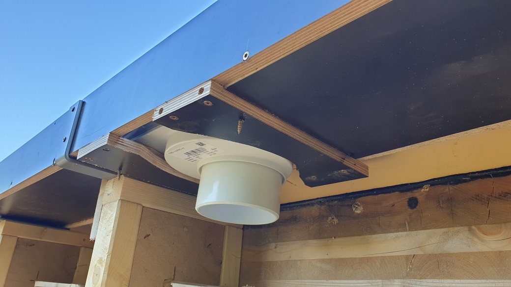 Vlastné telo žľabu bolo vytvorené z vodeodolnej preglejky, ktorá bola vložená do priestoru vzniknutého úpravou PIR dosiek. Pre zabezpečenie potrebnej tuhosti a stability boli použité zámočnícky vyrobené oceľové háky, ktoré zároveň definujú zvislý obrys žľabu. Dno z preglejky bolo vyspádované smerom k odvodňovaciemu prvku podložením prírezmi dosiek.