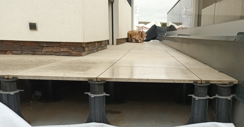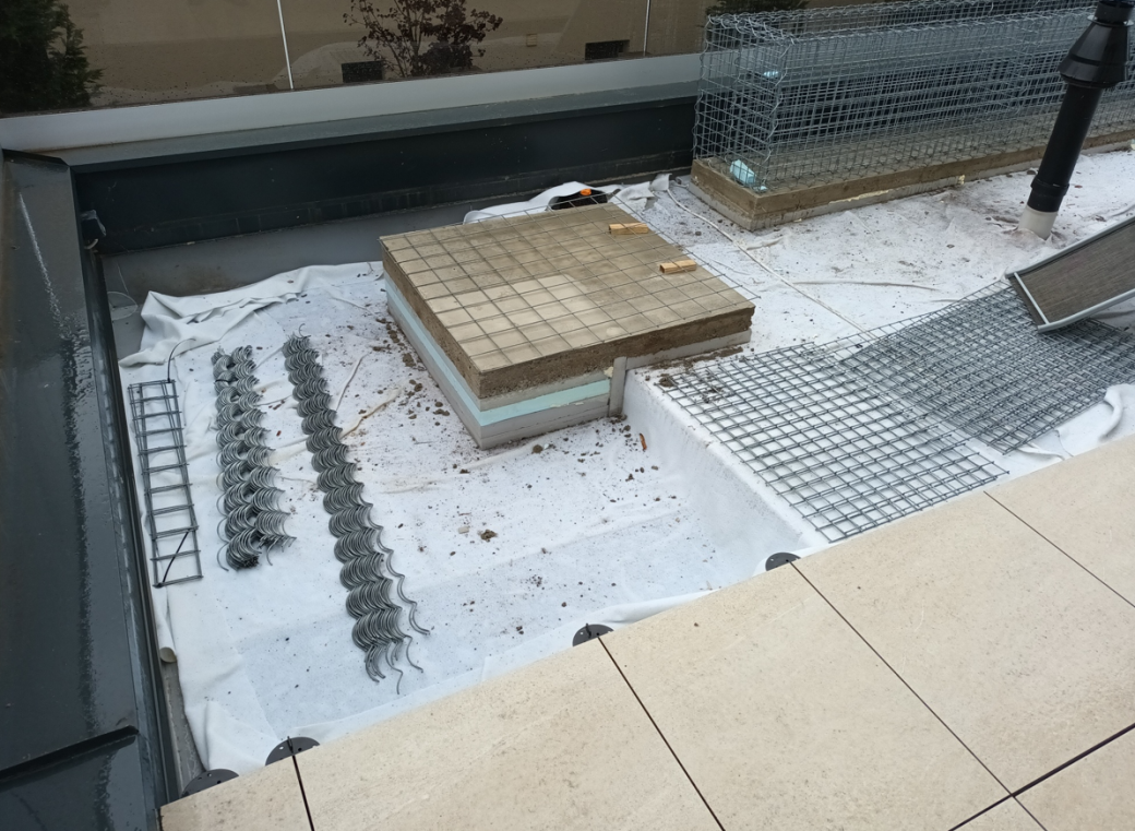 Na časti plochy zostala keramická dlažba na rektifikačných terčoch, ktorá slúžila naďalej pre pochôdznu časť strechy.