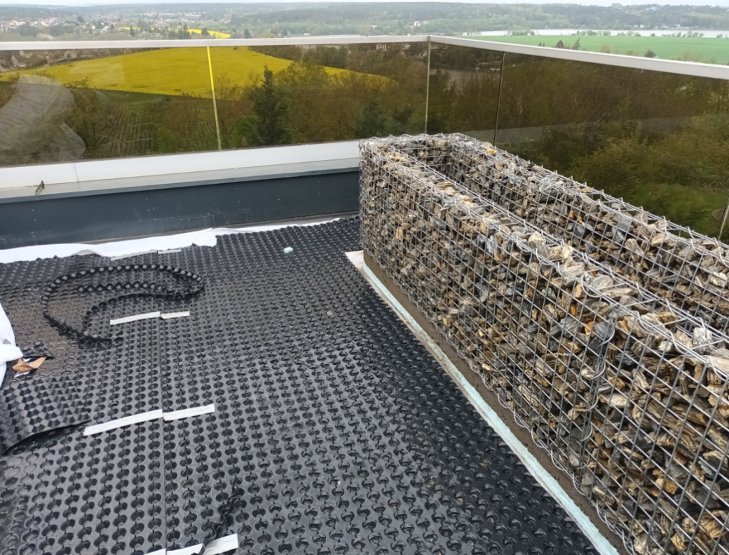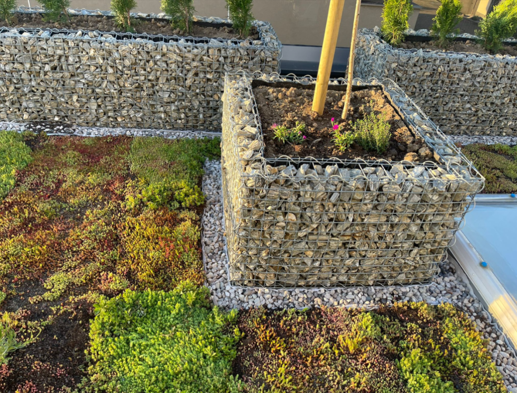 Ako prvé sa zrealizovali kvetináče z gabiónov, ktoré slúžili ako hlavný dekoračný prvok novej strešnej záhrady. Na separačnú a ochrannú textíliu plošnej hmotnosti 500 g/m2 boli položené dosky z extrudovaného polystyrénu. Následne betónové základové pätky, ktoré zároveň slúžili ako vyrovnanie sklonu povrchu hydroizolácie. Na betónových pätkách boli pospájané nerezové gabiónové klietky pre budúce kvetináče. Do klietok sa následne vkladalo dekoračné kamenivo. Rozmiestnenie kvetináčov z hľadiska odvodnenia strechy nevyžadovalo pokladať ich drenážnu vrstvu.