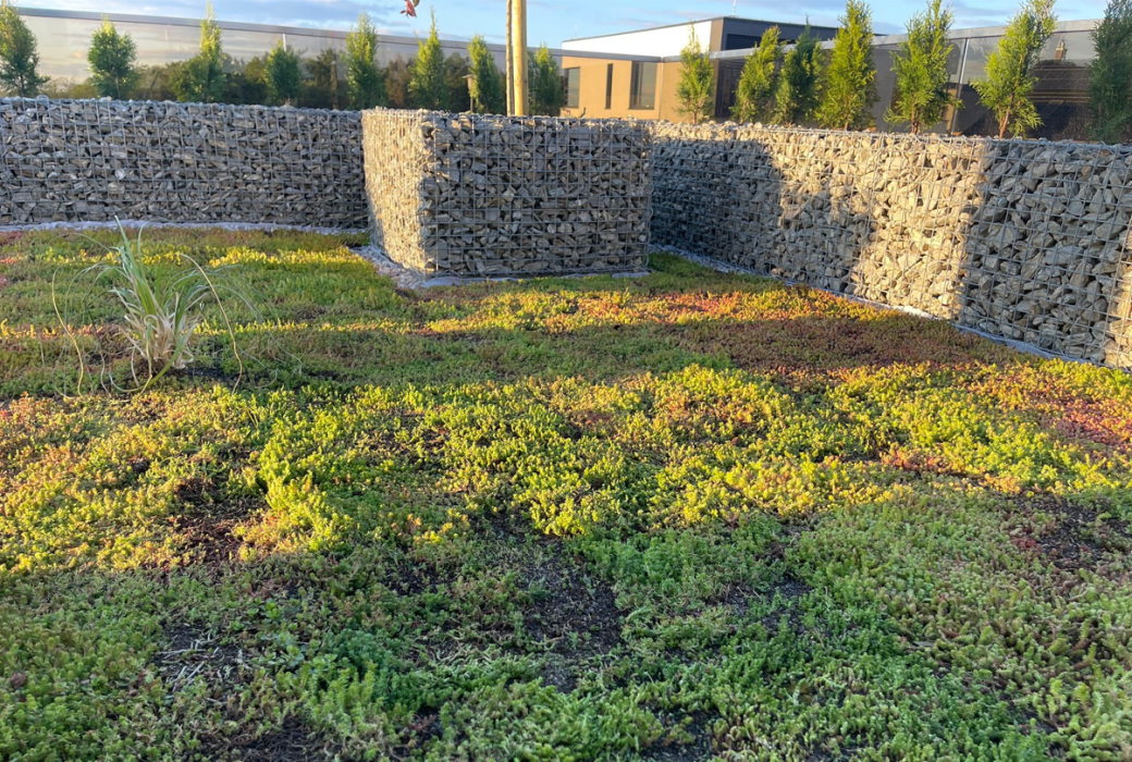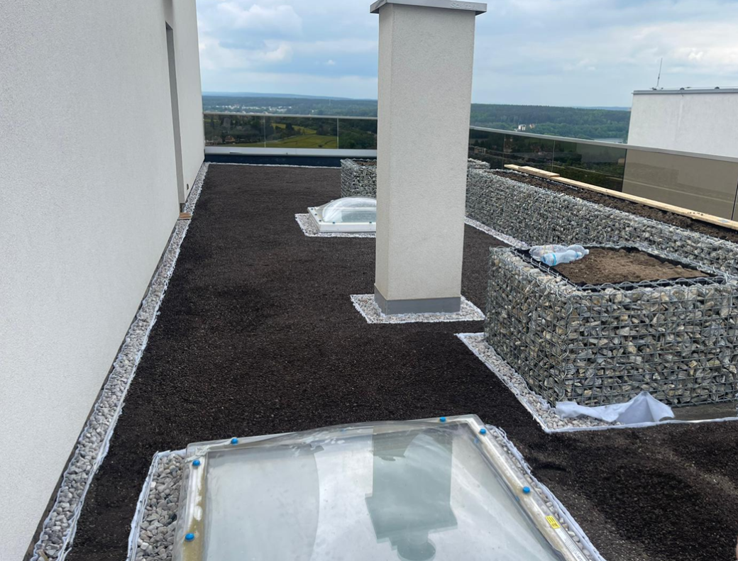 V ploche strechy bola zrealizovaná skladba extenzívnej vegetačnej strechy. Na ochrannú fóliu sa položila nopová fólia určená pre vegetačné strechy s výškou nopov 40 mm a s potrebnou perforáciou. Nopová fólia nám vytvorila drenážnu a hydroakumulačnú vrstvu. Na túto vrstvu sa položila filtračná textília s plošnou hmotnosťou 200 g/m2 a vrstva extenzívneho substrátu. Ako praktický a estetický doplnok sa do substrátu osadili nášľapné kamene oválneho tvaru. Tie vytvorili cestičku pre údržbu drevín v kvetináčoch.