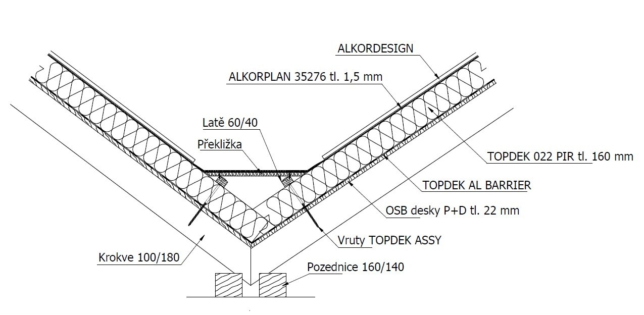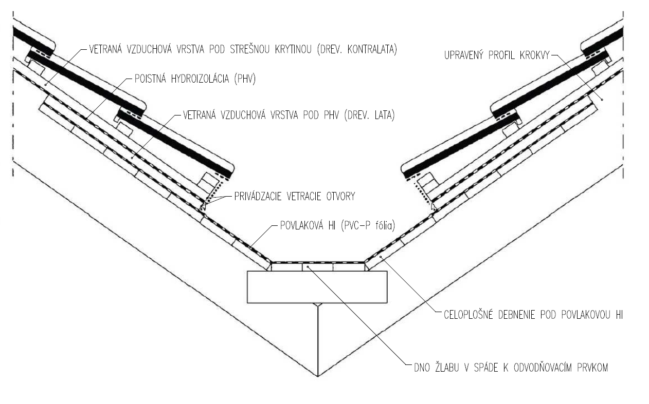 Podkladová konštrukcia medzistrešného žľabu bola vytvorená z vodorovne uložených drevených dosiek, na ktoré nadväzovali dosky uložené šikmo na krokvy so zníženou hrúbkou. Realizátor navrhol na vodorovnú nosnú vrstvu uložiť spádové dosky z expandovaného polystyrénu (EPS) so spádom od stredu medzistrešného žľabu k štítovým stenám, kde bolo plánované odvodnenie pomocou cezatikových chrličov. Na EPS a drevené dosky uložené šikmo na krokvách plánoval uložiť separačnú vrstvu z geotextílie a povlakovú hydroizoláciu s dostatočným vytiahnutím nad rovinu dna žľabu. Povlaková hydroizolácia bola v tomto prípade zvolená z fólie z mäkčeného PVC. PHV pod skladanou krytinou uvažoval realizátor odvodniť na povlakovú hydroizoláciu medzistrešného žľabu. Privádzacie vetracie otvory vetranej vzduchovej vrstvy pod skladanou krytinou plánoval osadiť vyššie nad dno medzistrešného žľabu. Realizátor sa ale obával nedostatočného vetrania vzduchovej vrstvy pod medzistrešným žľabom, nebezpečenstva kondenzácie na dolnej strane medzistrešného žľabu a následného rizika degradácie zabudovaných drevených prvkov.
